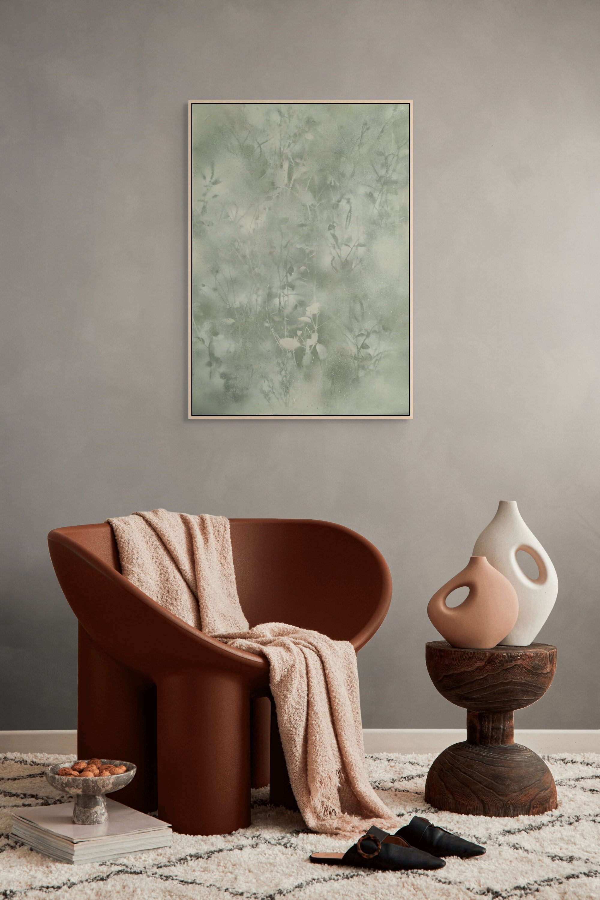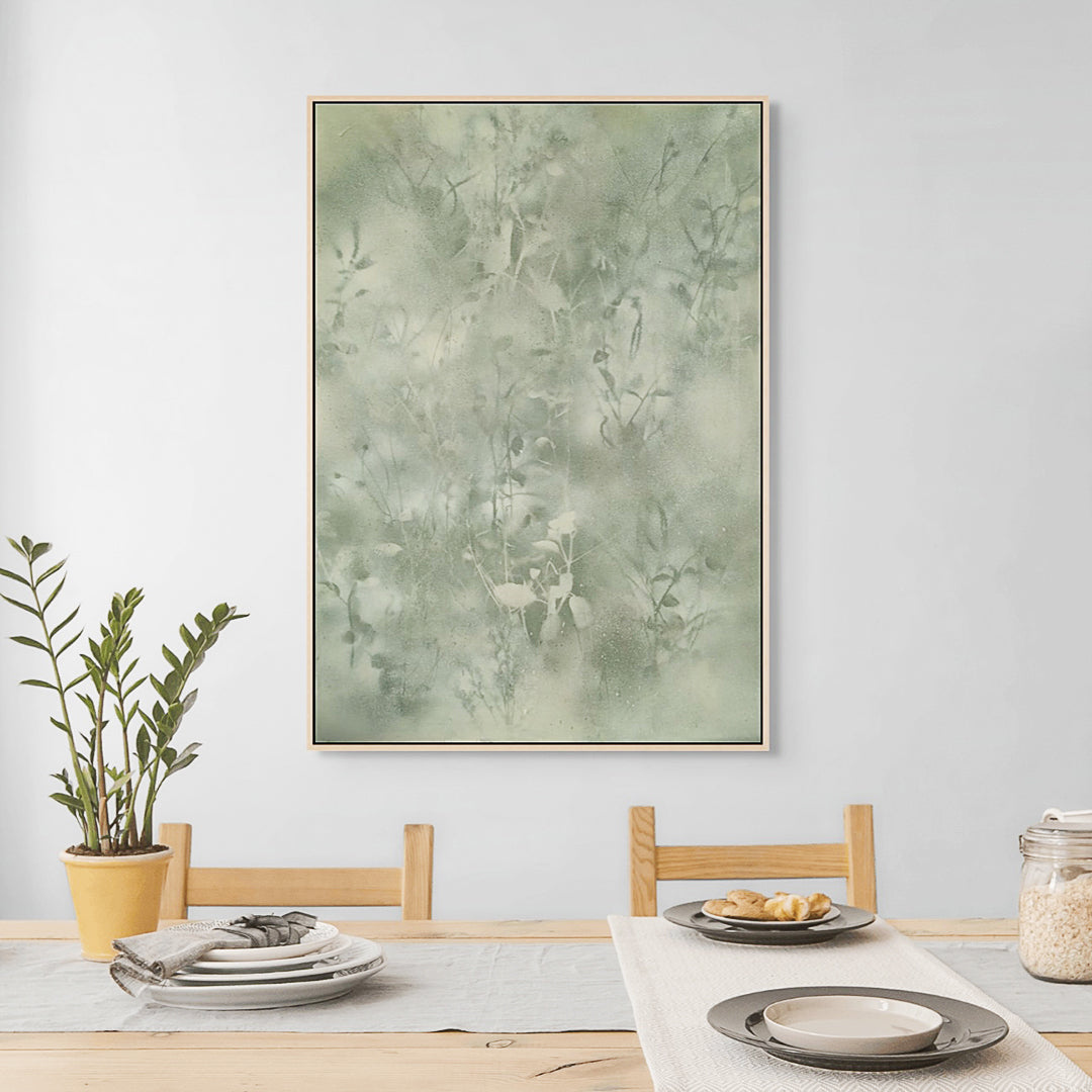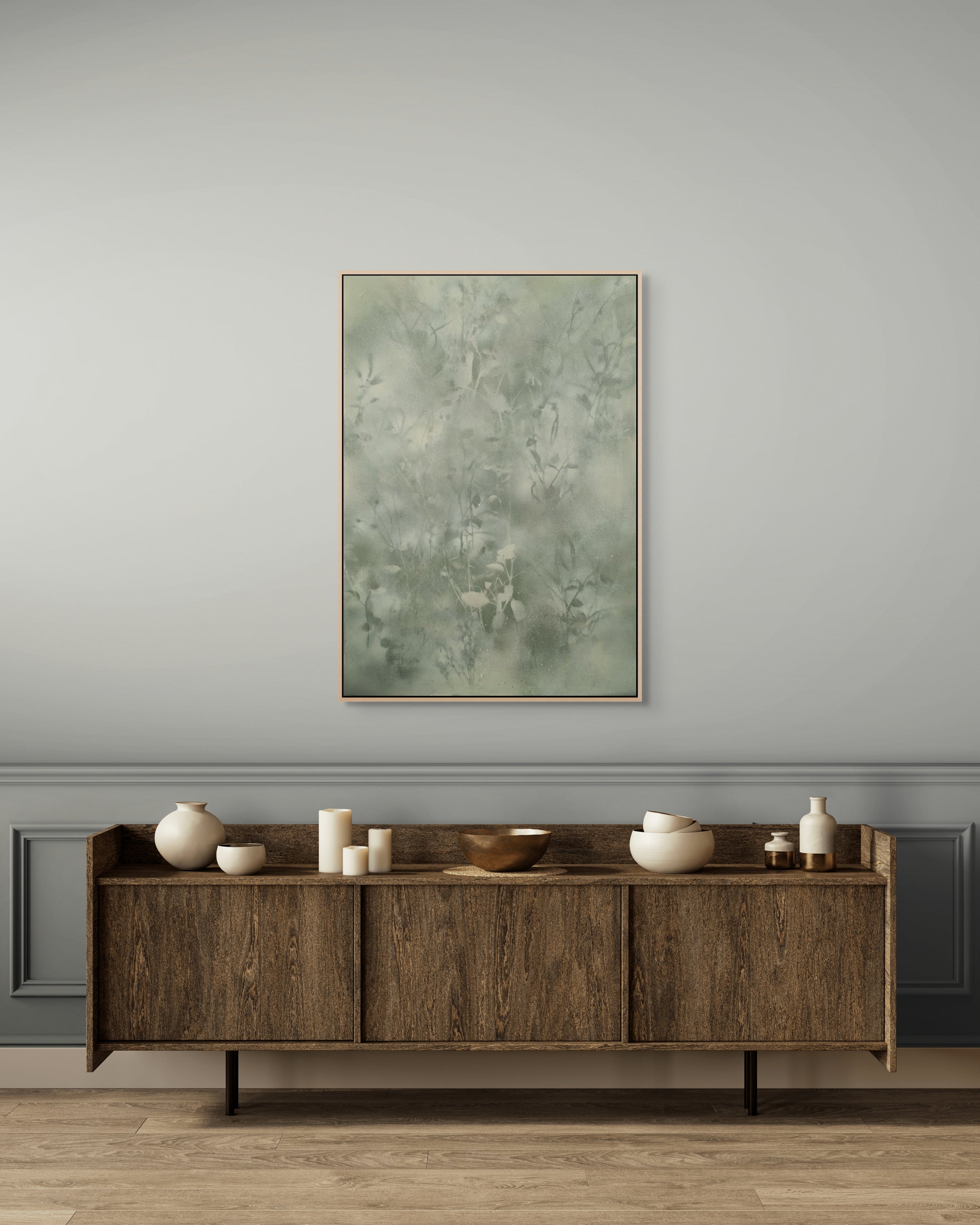 Emoldurado num suporte flutuante de madeira e pronto a pendurar.