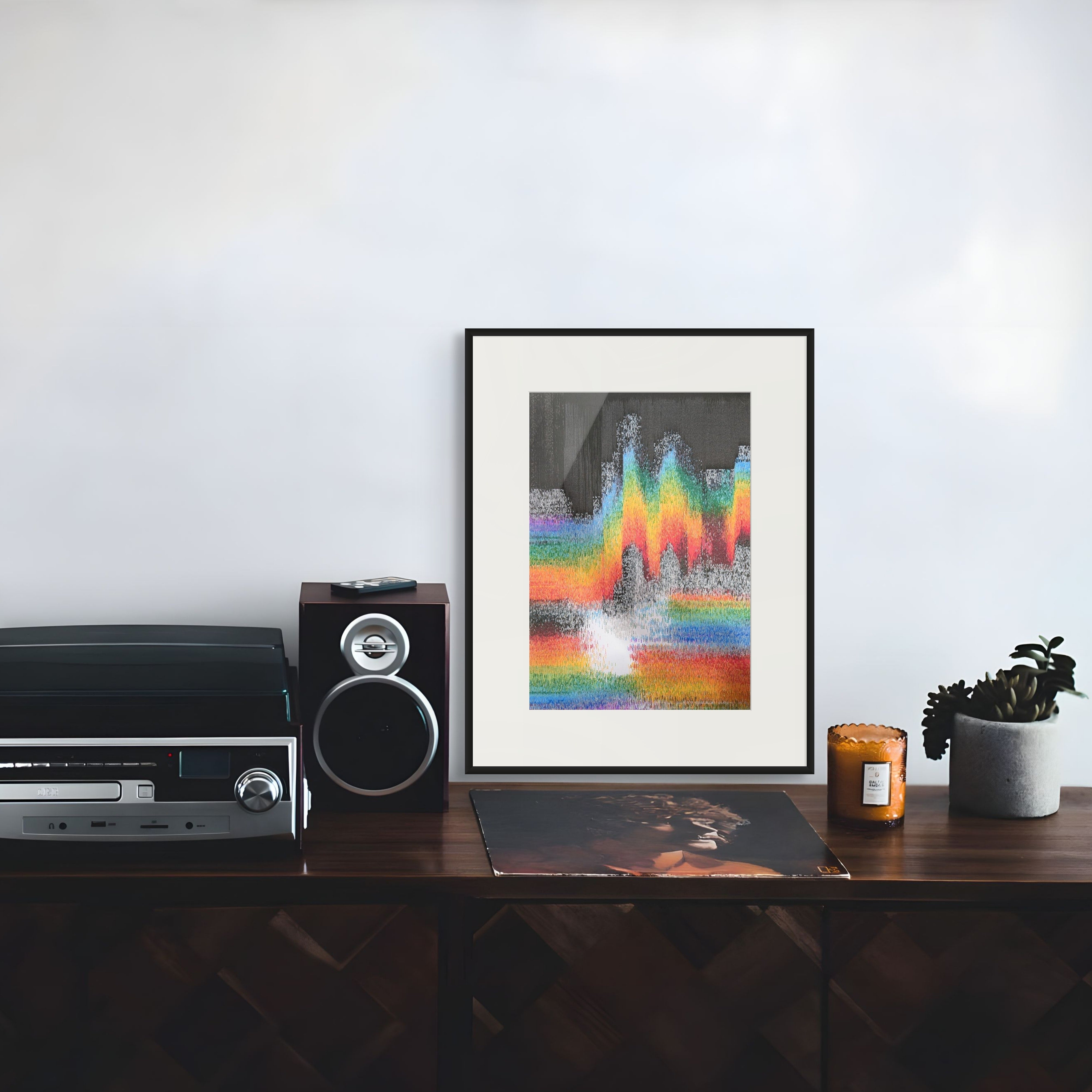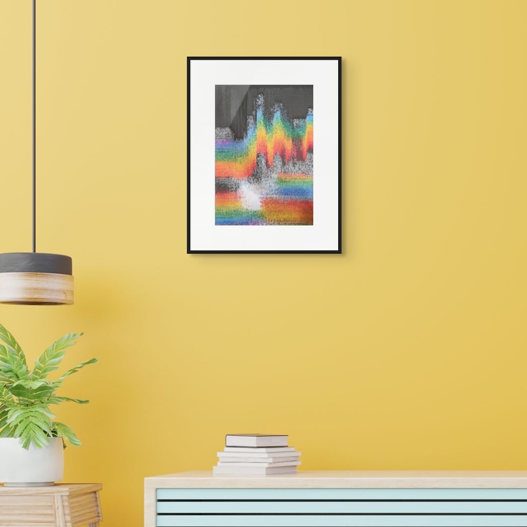 Uma obra de arte explora a tensão entre um espectro de cores vibrantes e a estática digital monocromática.